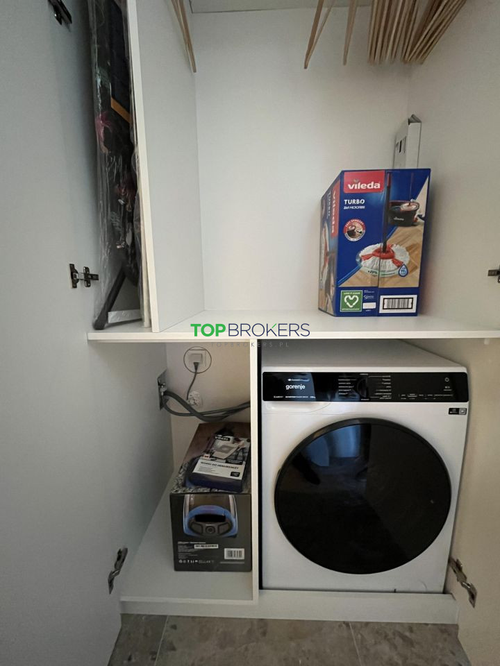 * przedpokój : szafa na ubrania i buty, pralko-suszarka, deska do prasowania, suszarka manualna, odkurzacz;