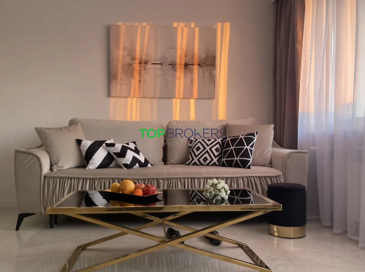 * salon z aneksem kuchennym i wyjściem na loggię: kanapa, lada, lustro, sterowane oświetlenie;