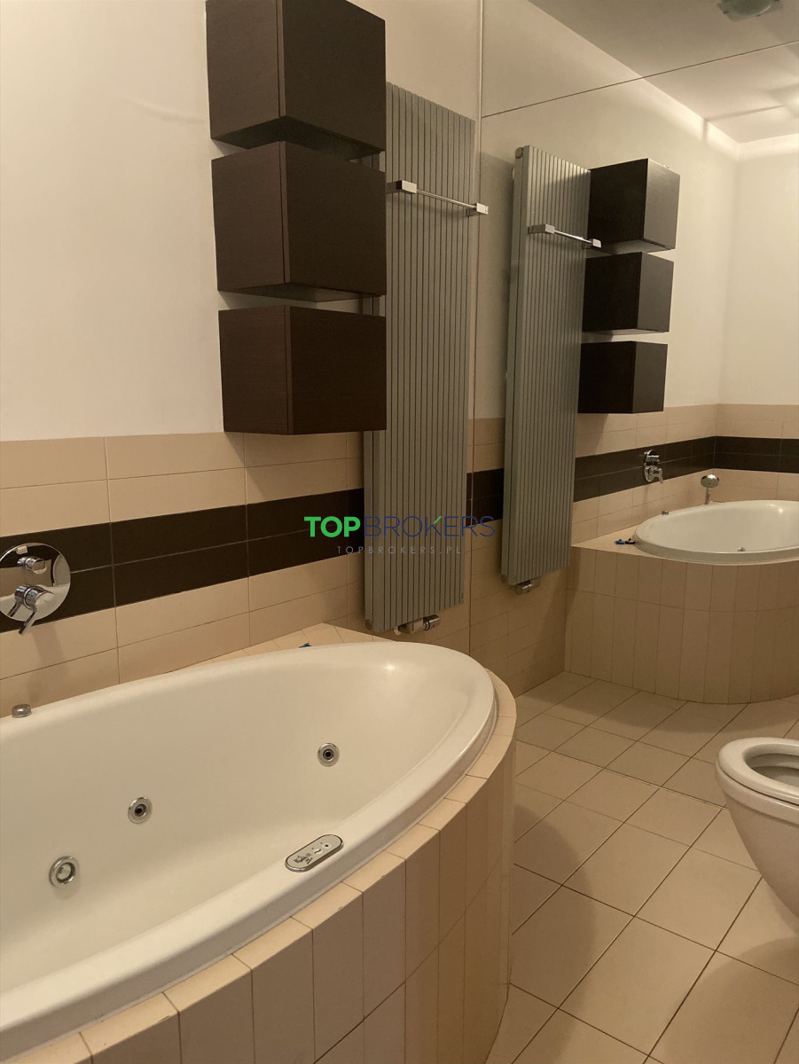 * przestronna łazienka: wanna z jacuzzi, oddzielny prysznic, umywalka, wc, lustro, szafki;
