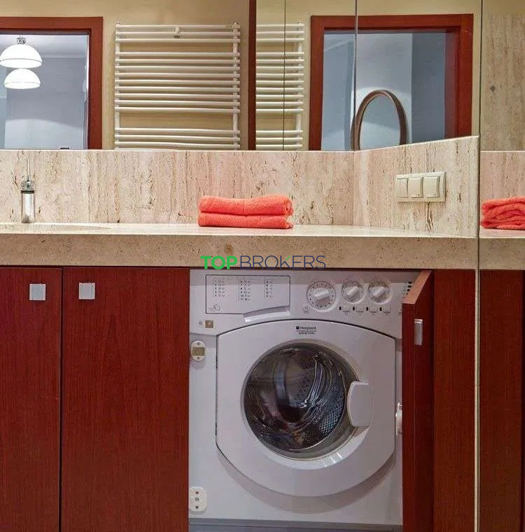 * łazienka: wanna z funkcją prysznica, wc, pralka, umywalka, lustro;